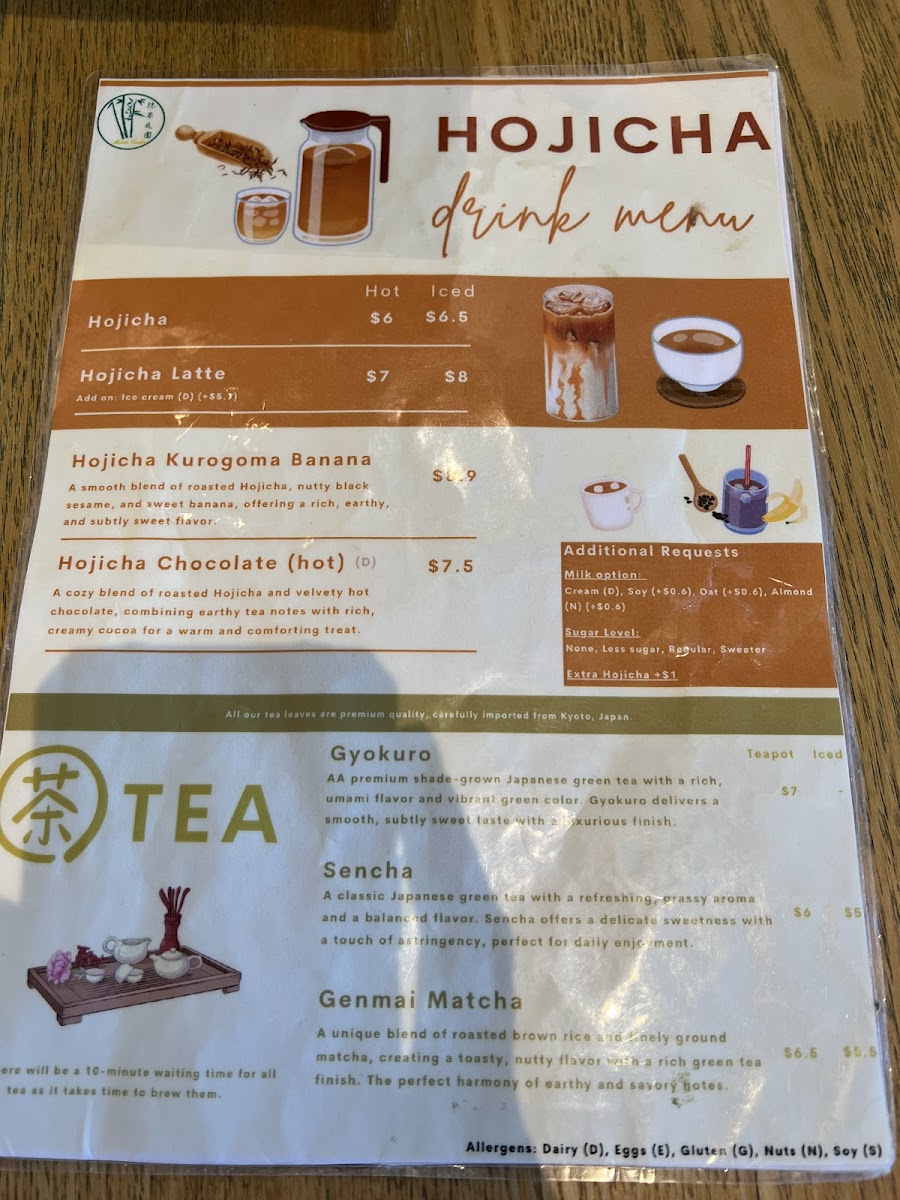 The menu at this cafe features a variety of matcha and hojicha-based beverages, traditional and contemporary Japanese-inspired desserts, as well as classic coffee options. It is designed to cater to those seeking specialty tea drinks, dessert treats, and light refreshment throughout the day.